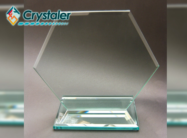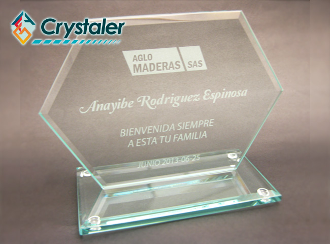 Placa de reconocimiento en vidrio de 10 mm, pulida y biselada, grabada en sandblasting.