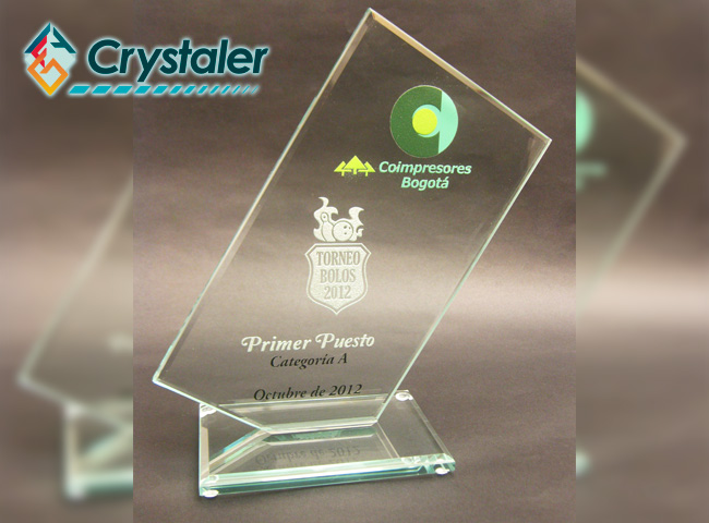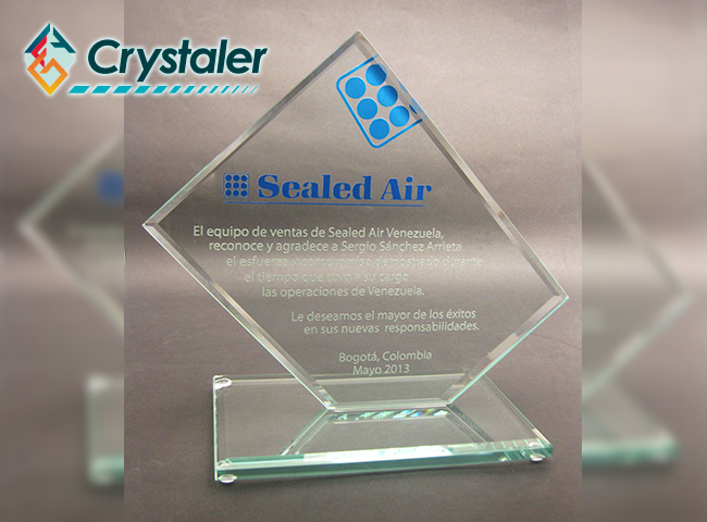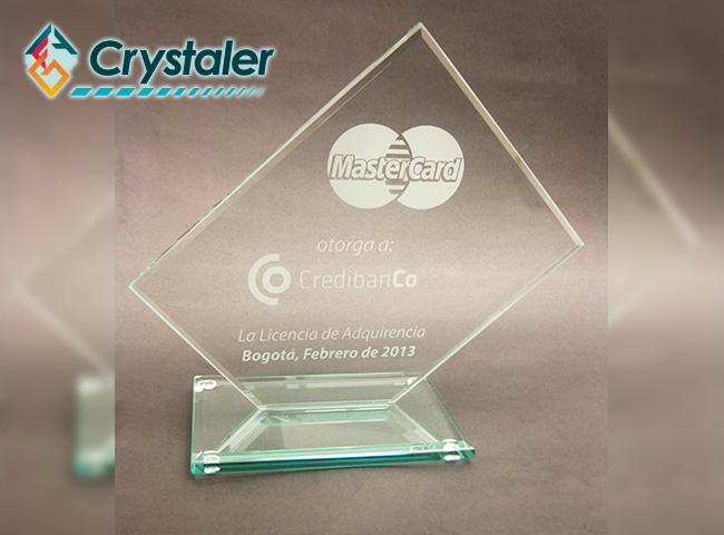 Placa en vidrio de 10 mm, pulida y biselada grabada con texto en sandblasting a color.