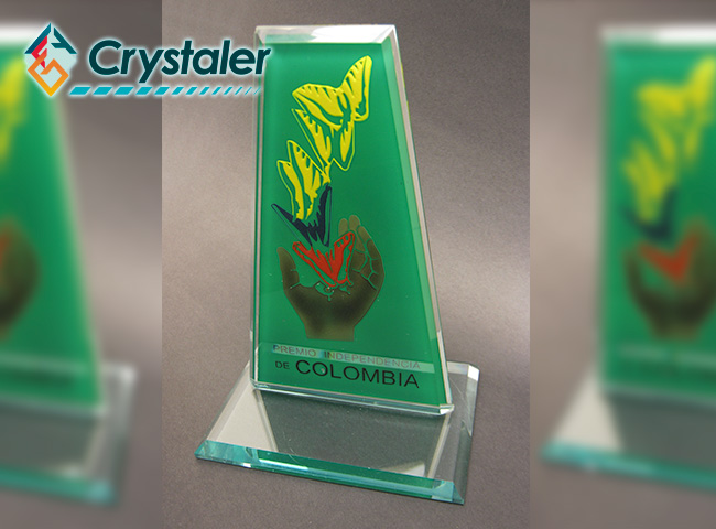 Placa en vidrio de 10 mm, pulida y biselada grabada con texto en sandblasting a color y fondo verde.