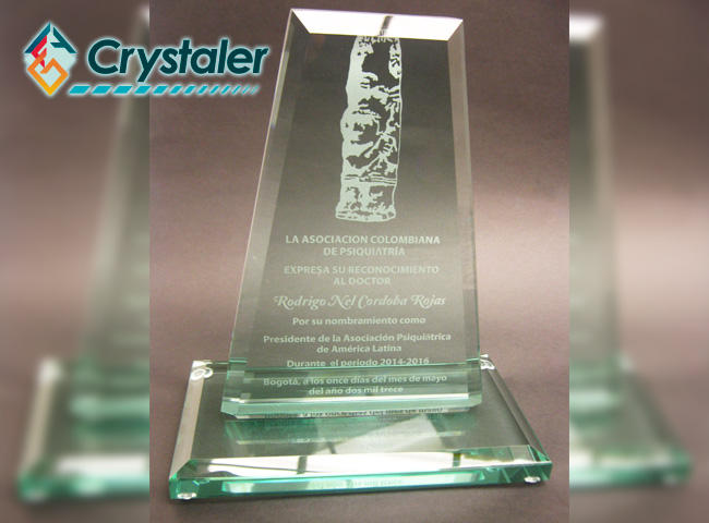 Placa en vidrio de 19 mm, pulida y biselada grabada con texto en sandblasting.