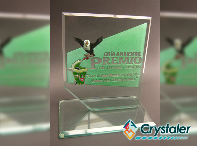 Placa en vidrio de 10 mm, pulida y biselada grabada con texto en sandblasting a color.